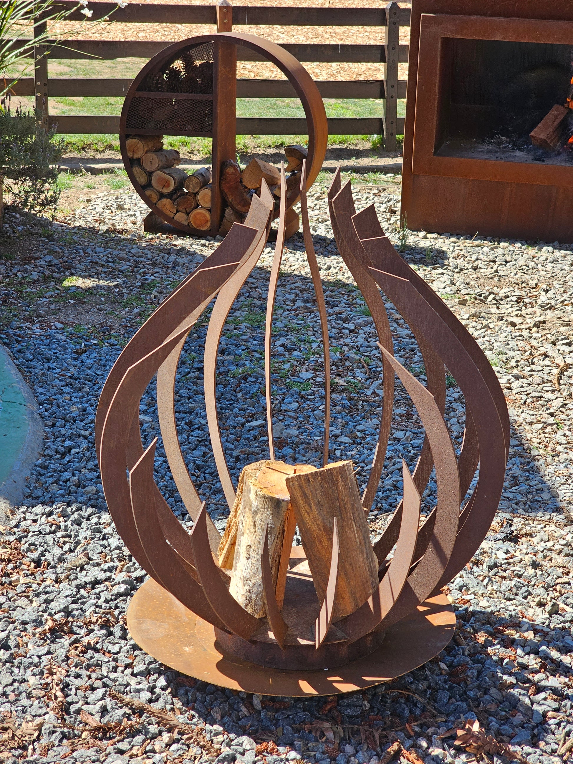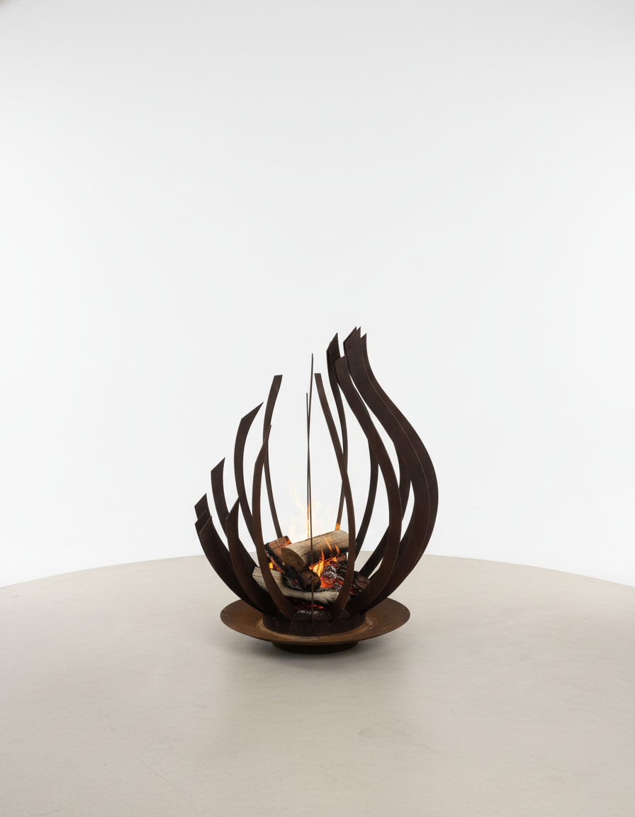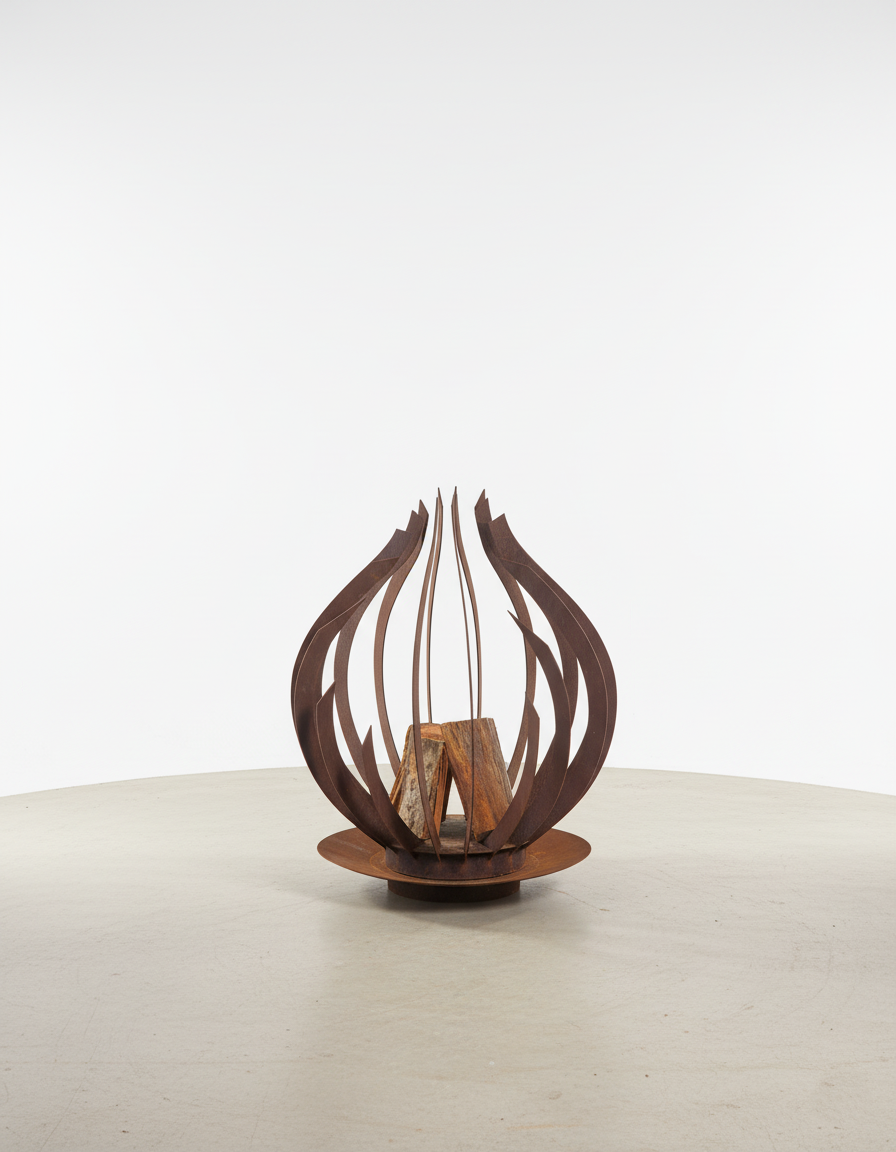 El Fogón Hera es una pieza escultórica de fuego y diseño. Inspirado en los pétalos cerrados de una flor de acero, su forma envolvente evoca elegancia, protección y equilibrio. Fabricado íntegramente en acero corten, adquiere con el tiempo una pátina natural que lo hace único y resistente a la intemperie.