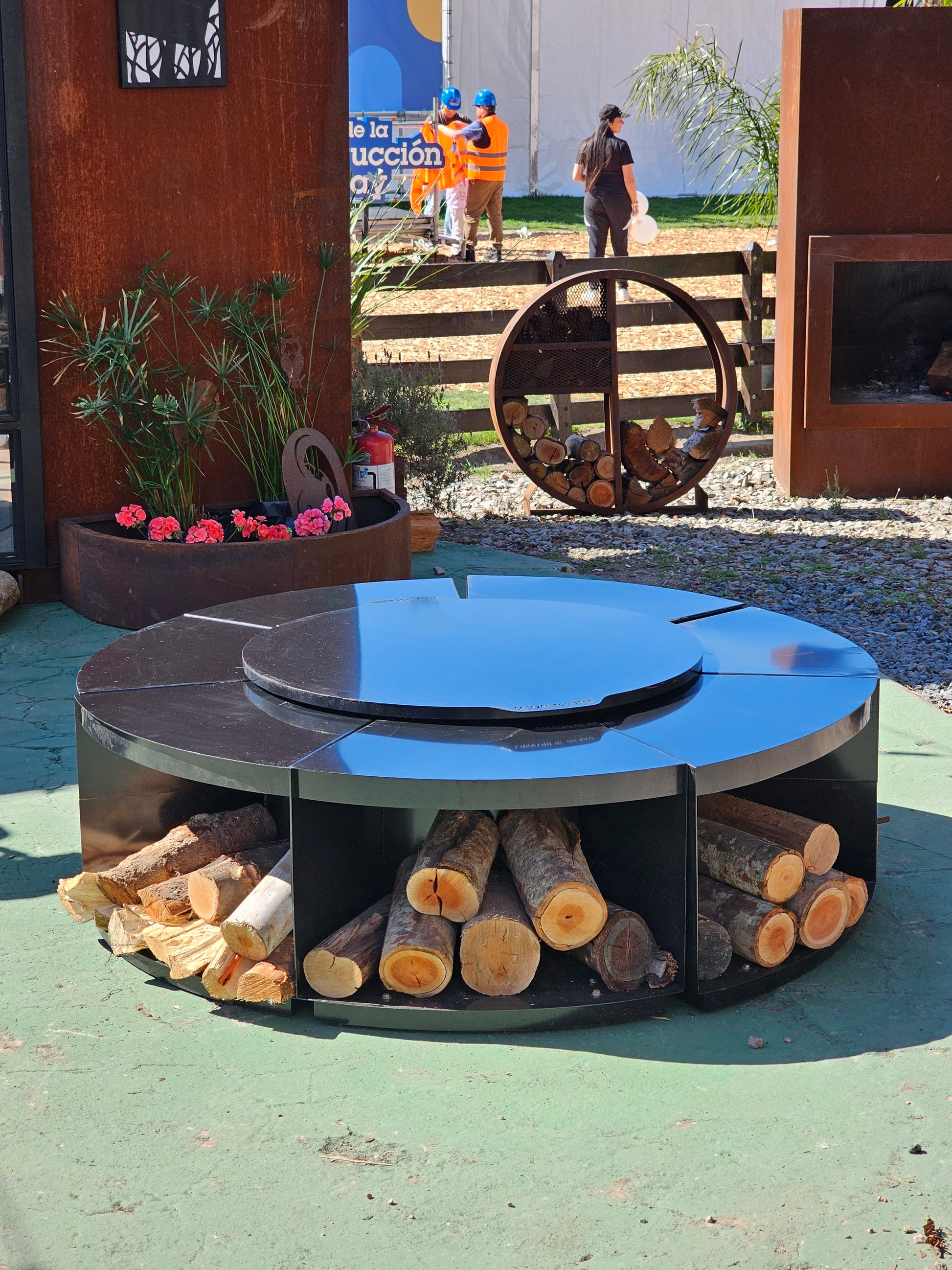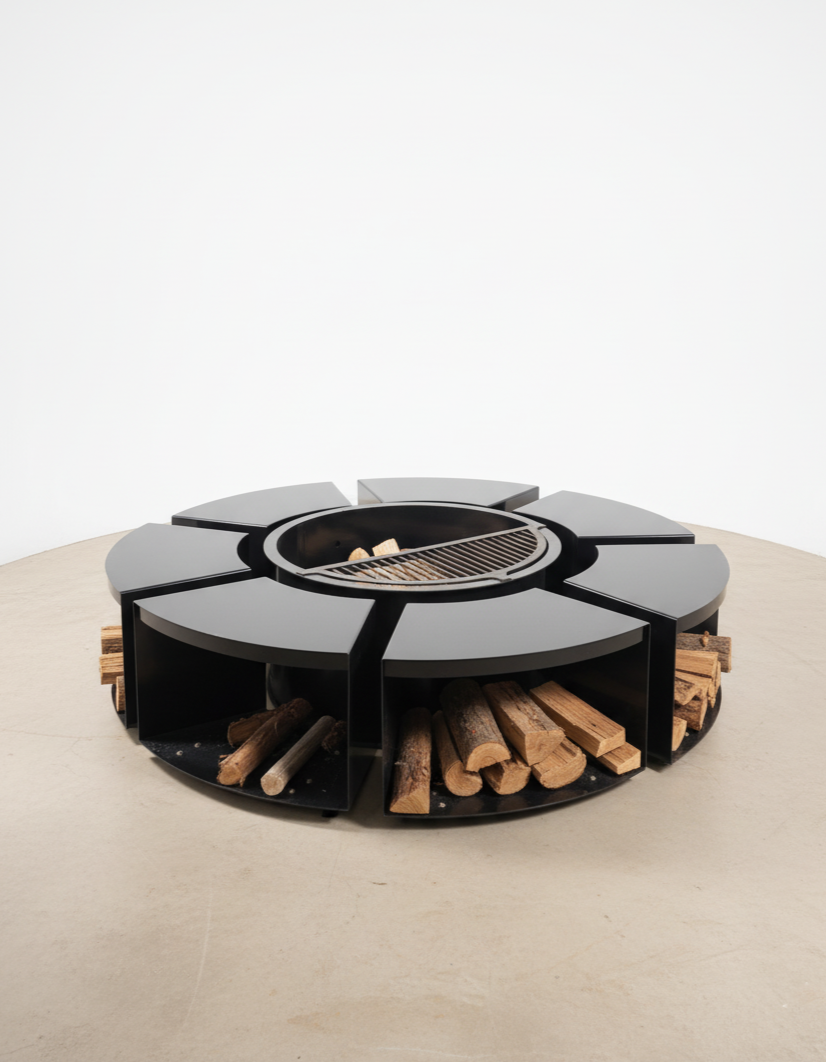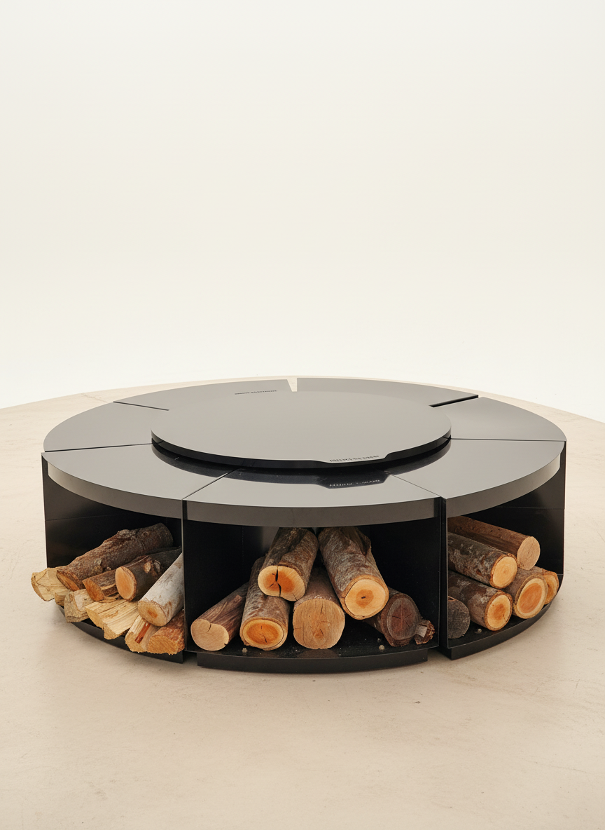 El Fogón Thor fusiona diseño, funcionalidad y presencia. Su estructura circular de acero pintado con terminación negra mate integra seis módulos con espacio para almacenar leña, creando una pieza imponente y práctica a la vez.
