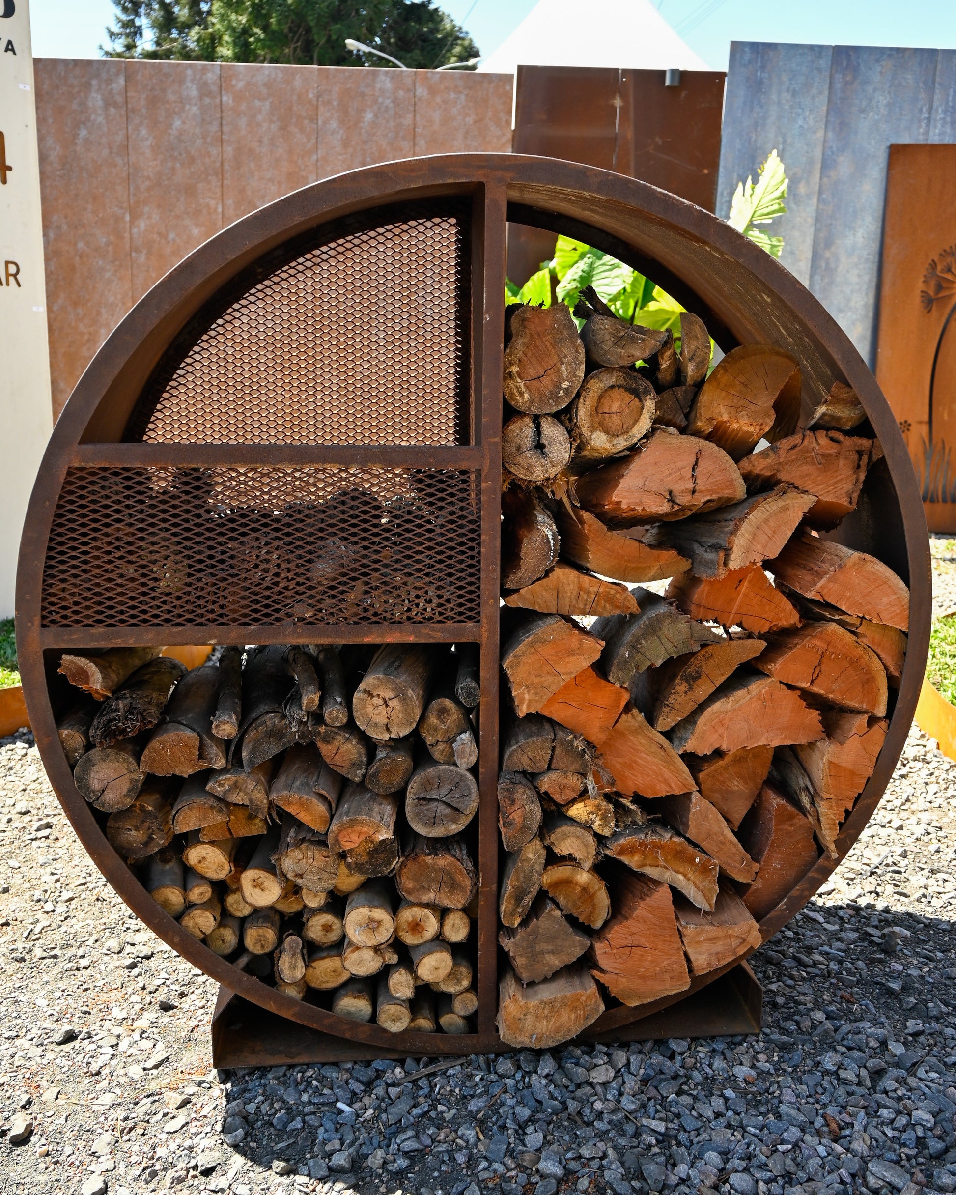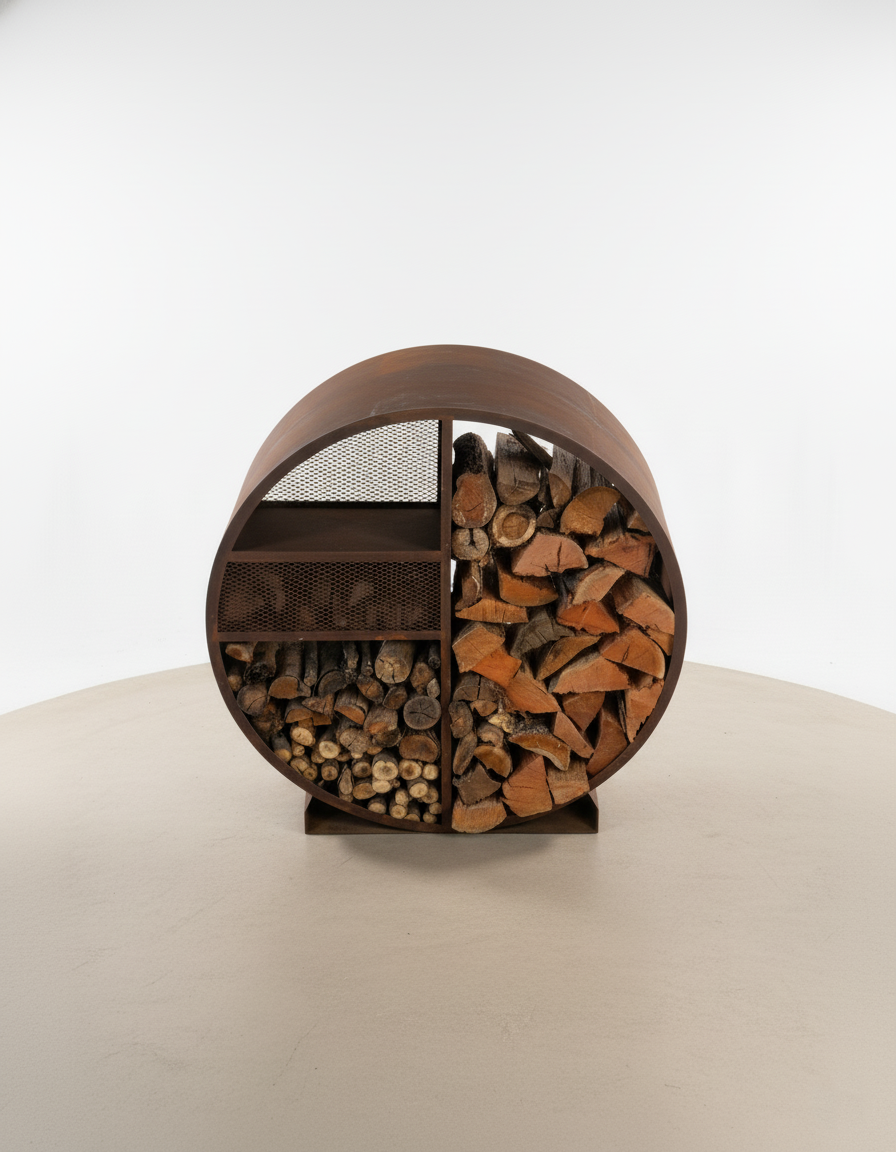 Los leñeros de acero corten están pensados como piezas de diseño que ordenan el fuego antes de encenderlo. Su estructura circular, limpia, sólida y contemporánea, aloja tres espacios definidos que organizan la leña por tamaño y textura, permitiendo crear composiciones cálidas y estéticas en cualquier ambiente. Cada compartimiento favorece la ventilación y convierte el almacenamiento en una experiencia visual.